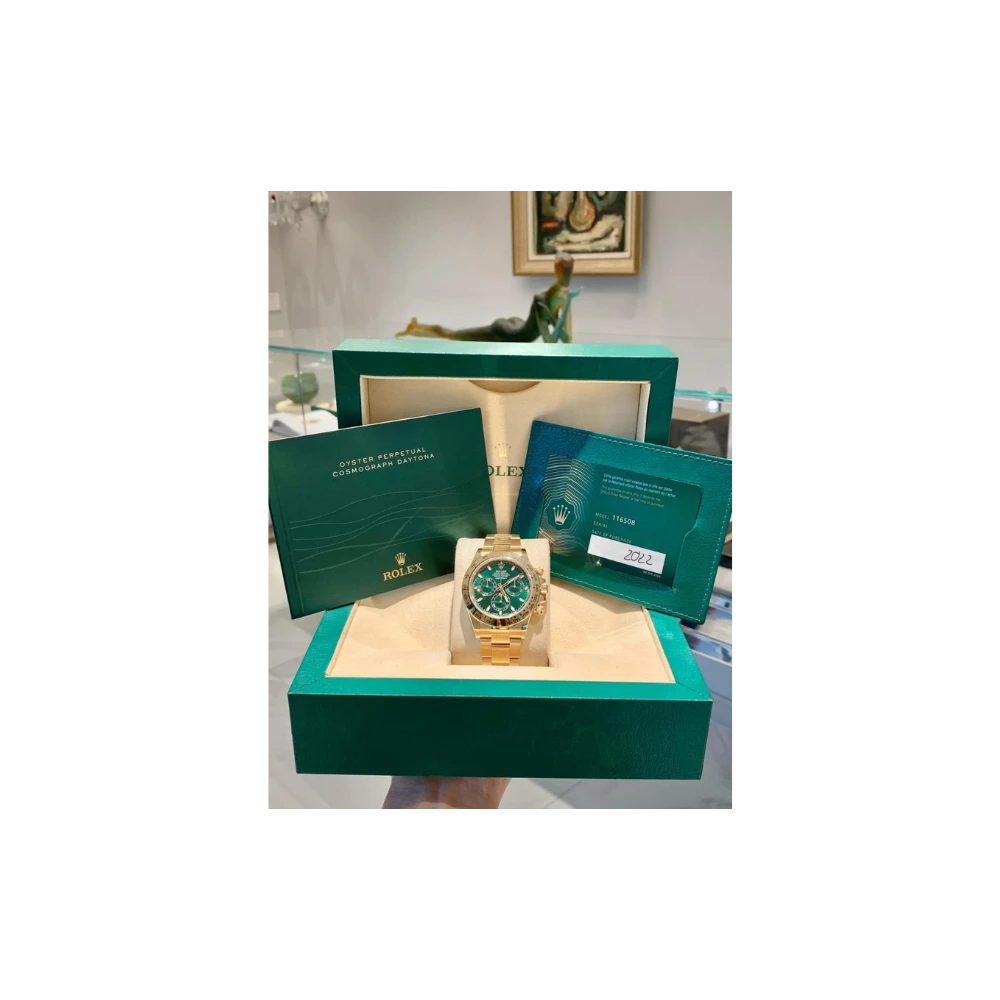 The Rolex Cosmograph Daytona Ref. 116508‑0013 masterfully combines performance and prestige. Its fully yellow-gold construction radiates luxury, while the vibrant green dial introduces an unexpected, modern twist to the classic Daytona aesthetic. The contrasting tones, subtle red highlights, and Chromalight lume enhance both functionality and appeal. Housing the advanced Calibre 4130, this Daytona offers cutting-edge chronograph precision, a 72-hour reserve, and everyday resilience. Endorsed by collectors, musicians, and athletes alike, it’s far more than a chronograph—it’s a statement of bold individuality, mechanical excellence, and collectible value.